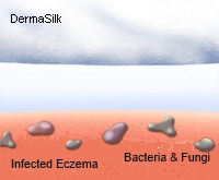 Silk is a protein fibre and as such can promote the growth of bacteria and fungi which can come into contact with it. This unwanted feature is a particular problem with eczematous skin, and those with gynaecological conditions as increased levels of bacteria can cause increased irritation. It is therefore vitally important to protect the silk from microbial contamination whilst on the wearer.